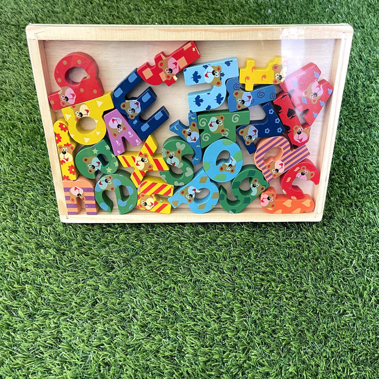 3d shapes wooden pieces with bright colors and cute patterns. Develop your child’s reading skills. Includes 26 alphabets in a wooden storage tray. Bright colors with cartoon illustrations. Package contains A-Z wooden alphabets in wooden box.